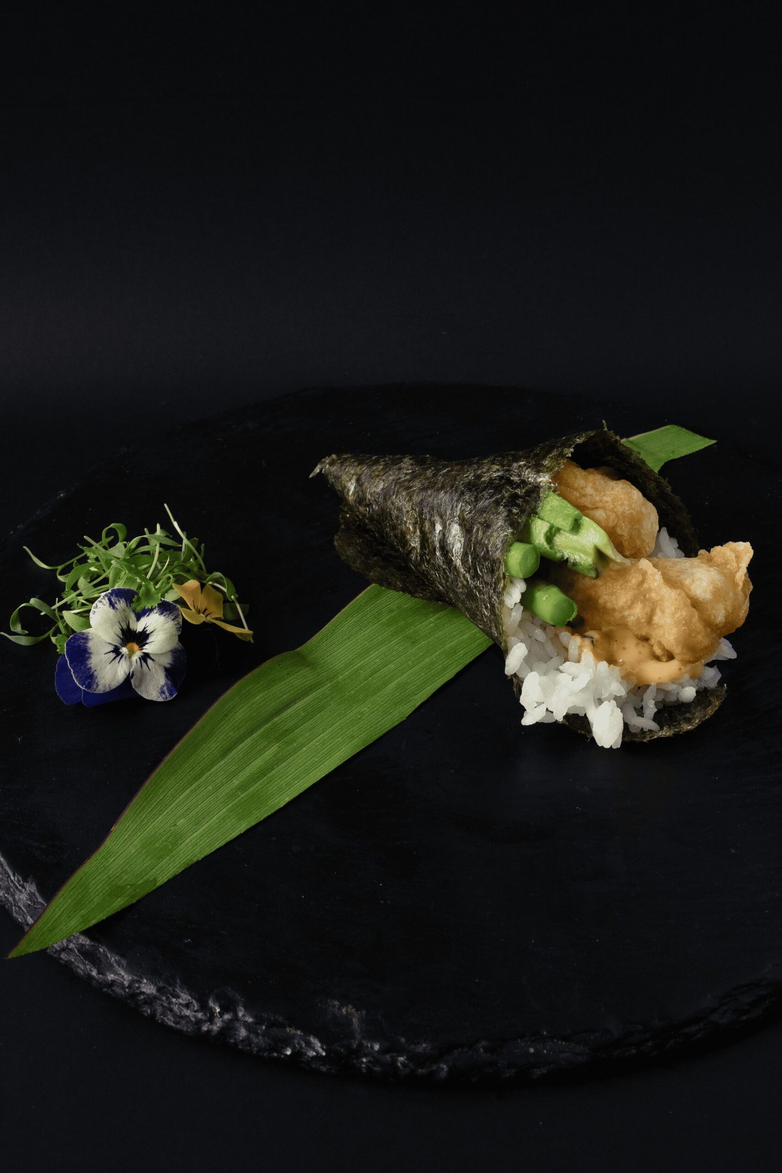 Cono de alga nori relleno de arroz de sushi, camarón tempura, espárrago, aguacate y spicy mayo.