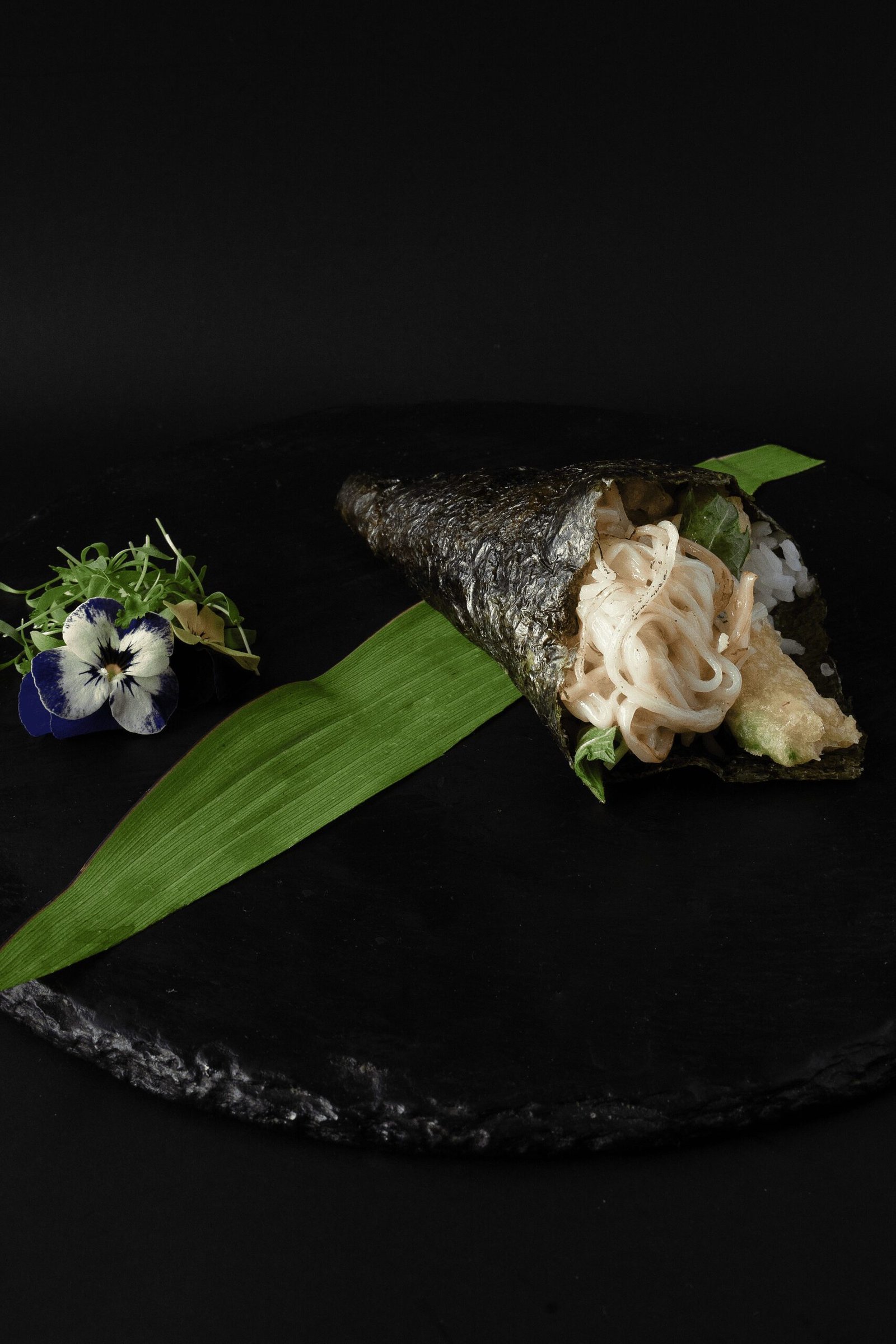 Cono de alga nori relleno de arroz de sushi, kanikama, alioli de trufa, tempura flakes y aguacate tempura.