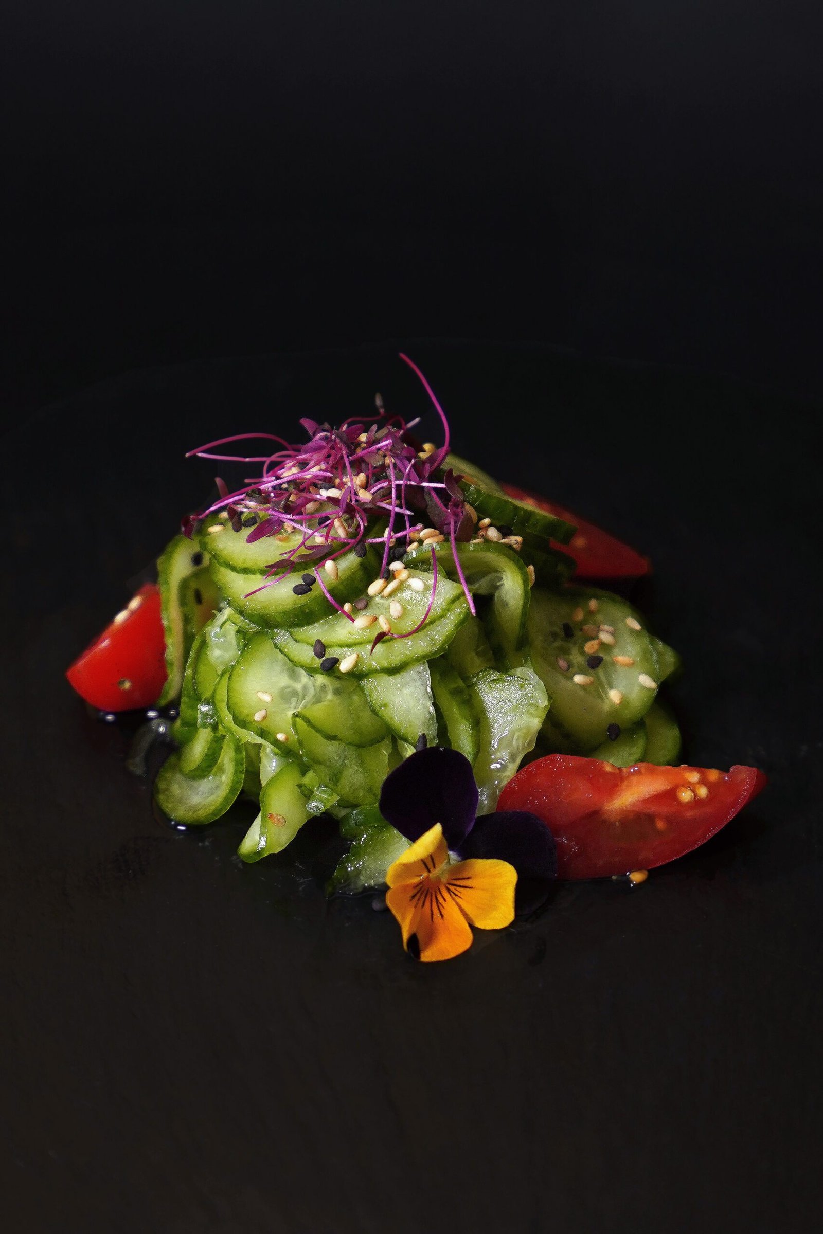 Pepino japonés marinado en vinagre de arroz dulce con ajonjolí tostado.
