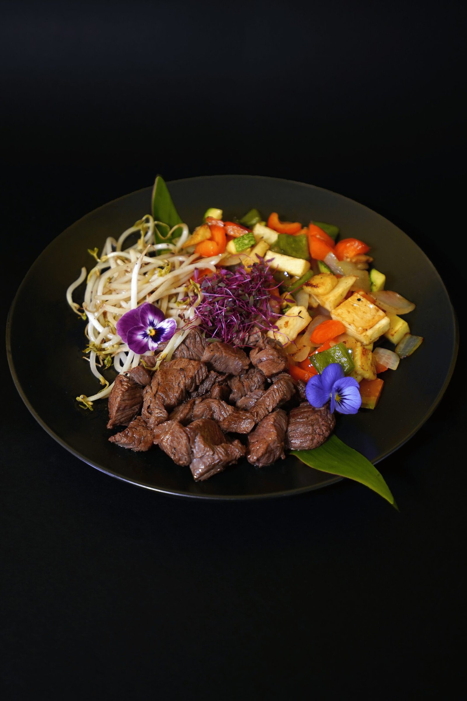 Rib eye a la plancha con verduras de temporada, arroz gohan y salsa de ajonjolí.
