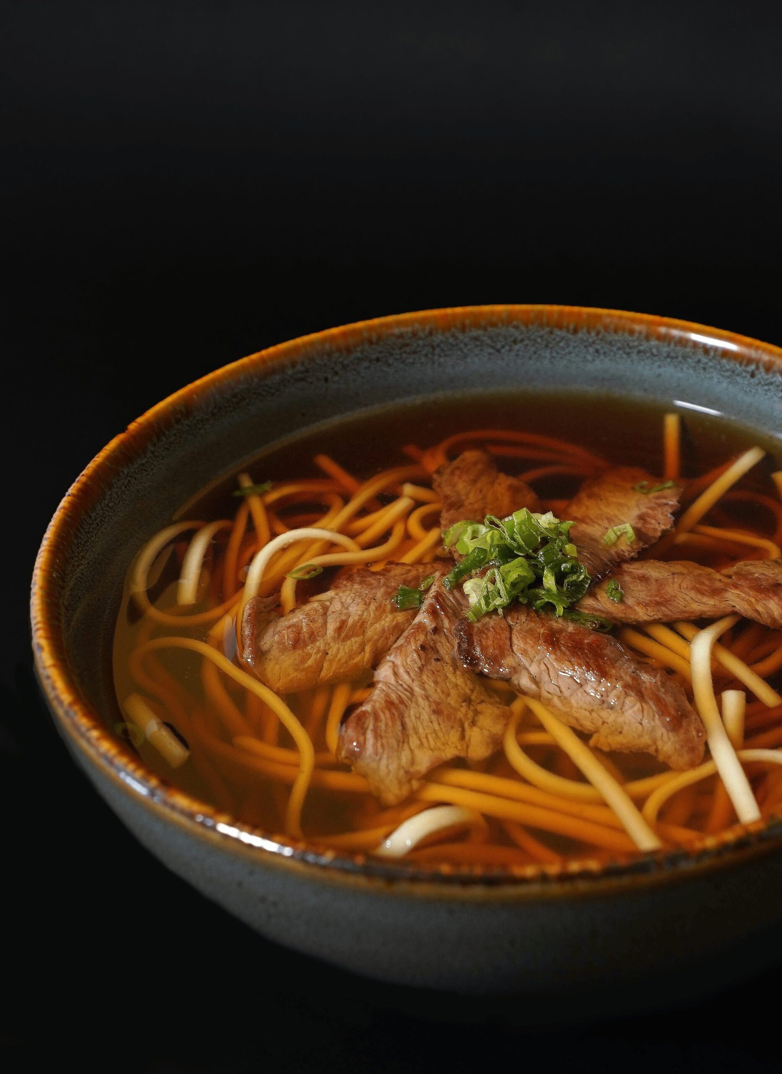 Fideos udon en caldo dashi casero, acompañados de rib eye a la plancha y cebollín.