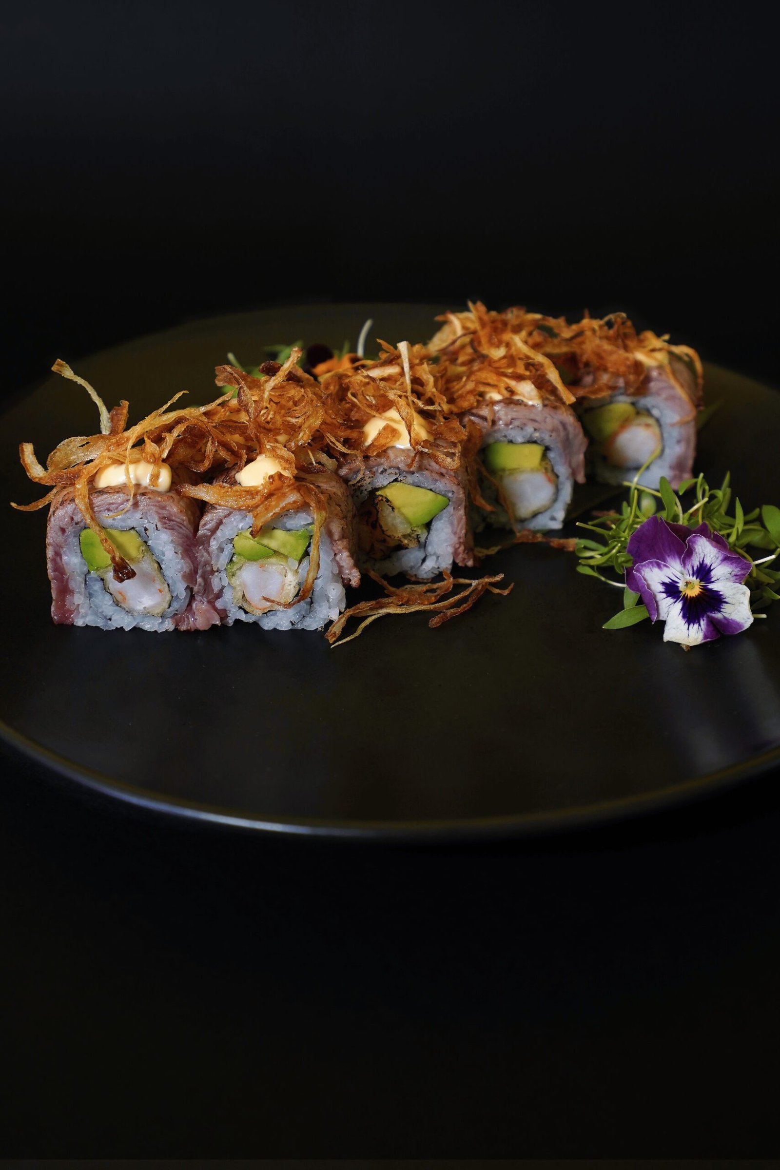 Por dentro: Camarón tempura y aguacate Por fuera: Rib eye, alioli de ajo y cebolla frita